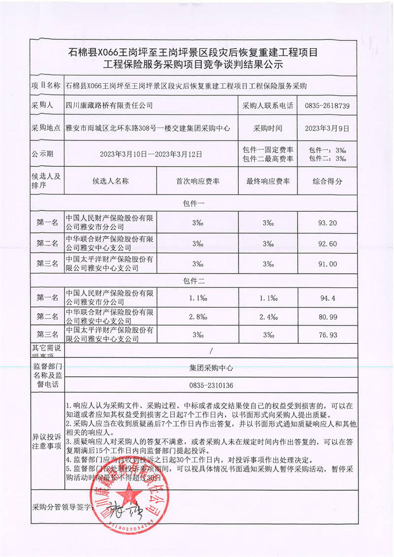 四川康藏路橋有限責(zé)任公司石棉縣X066王崗坪至王崗坪景區(qū)段災(zāi)后恢復(fù)重建工程項(xiàng)目工程保險服務(wù)采購競爭談判結(jié)果公示