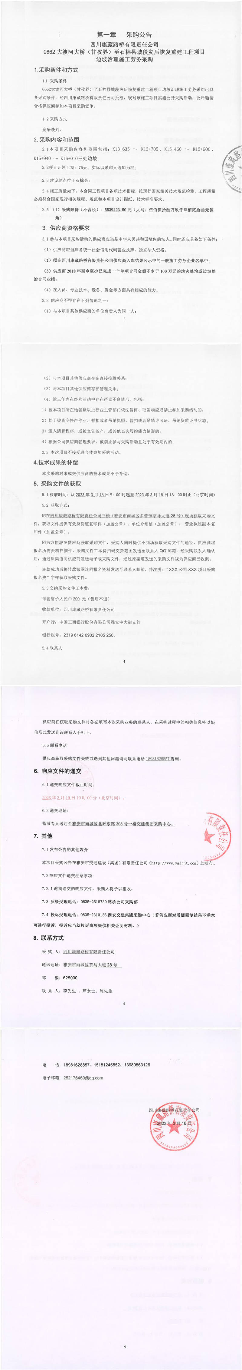 四川康藏路橋有限責(zé)任公司G662大渡河大橋(甘孜界)至石棉縣城段災(zāi)后恢復(fù)重建工程項目邊坡治理施工勞務(wù)采購公告