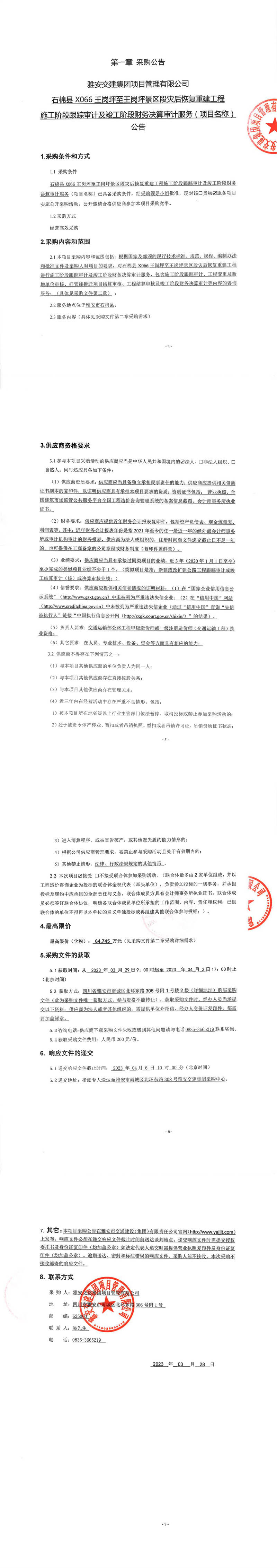 雅安交建集團(tuán)項目管理有限公司石棉縣X066王崗坪至王崗坪景區(qū)段災(zāi)后恢復(fù)重建工程施工階段跟蹤審計及竣工階段財務(wù)決算審計服務(wù)(項目名稱)公告