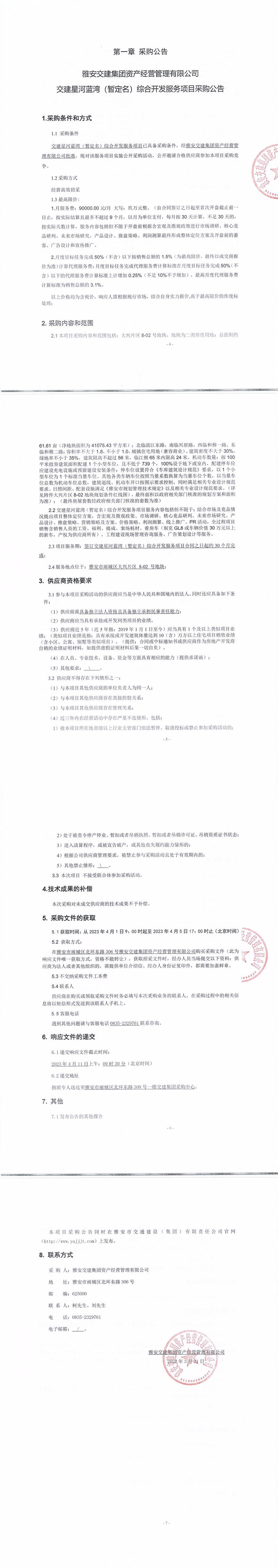 雅安交建集團(tuán)資產(chǎn)經(jīng)營管理有限公司交建星河藍(lán)灣(暫定名)綜合開發(fā)服務(wù)項(xiàng)目采購公告