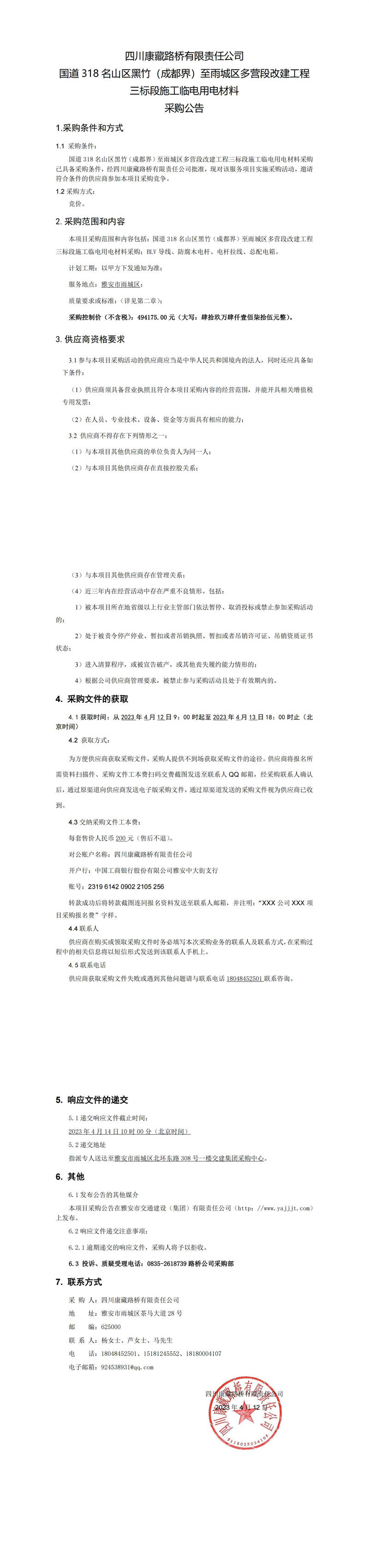 四川康藏路橋有限責(zé)任公司國(guó)道318名山區(qū)黑竹(成都界)至雨城區(qū)多營(yíng)段改建工程三標(biāo)段施工臨電用電材料采購(gòu)公告