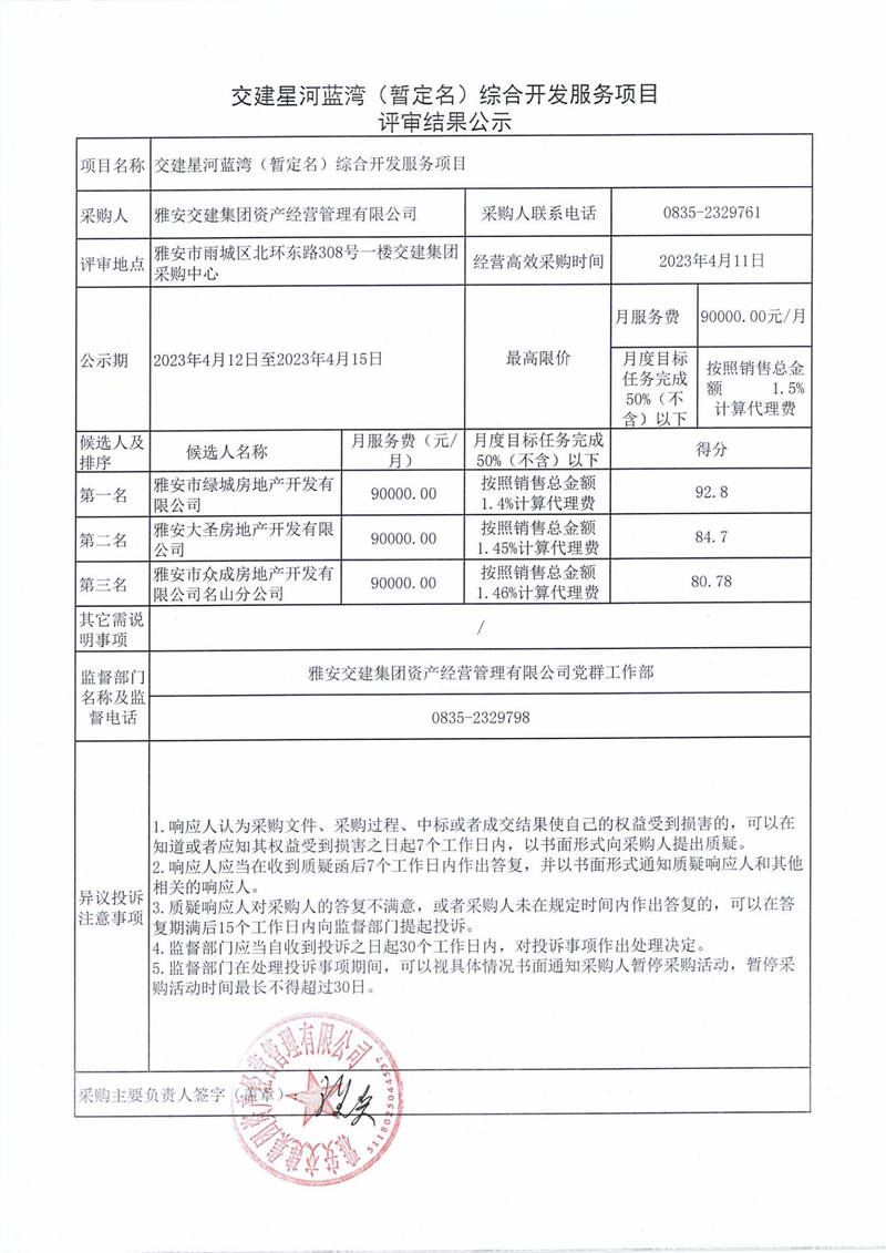 雅安交建集團(tuán)資產(chǎn)經(jīng)營管理有限公司交建星河藍(lán)灣(暫定名)綜合開發(fā)服務(wù)項(xiàng)目評(píng)審結(jié)果公示