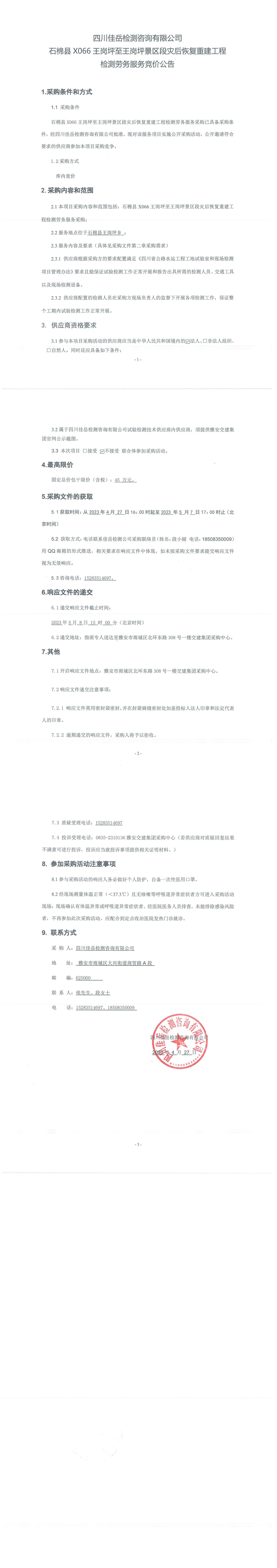 四川佳岳檢測(cè)咨詢有限公司石棉縣X066王崗坪至王崗坪景區(qū)段災(zāi)后恢復(fù)重建工程檢測(cè)勞務(wù)服務(wù)競價(jià)公告