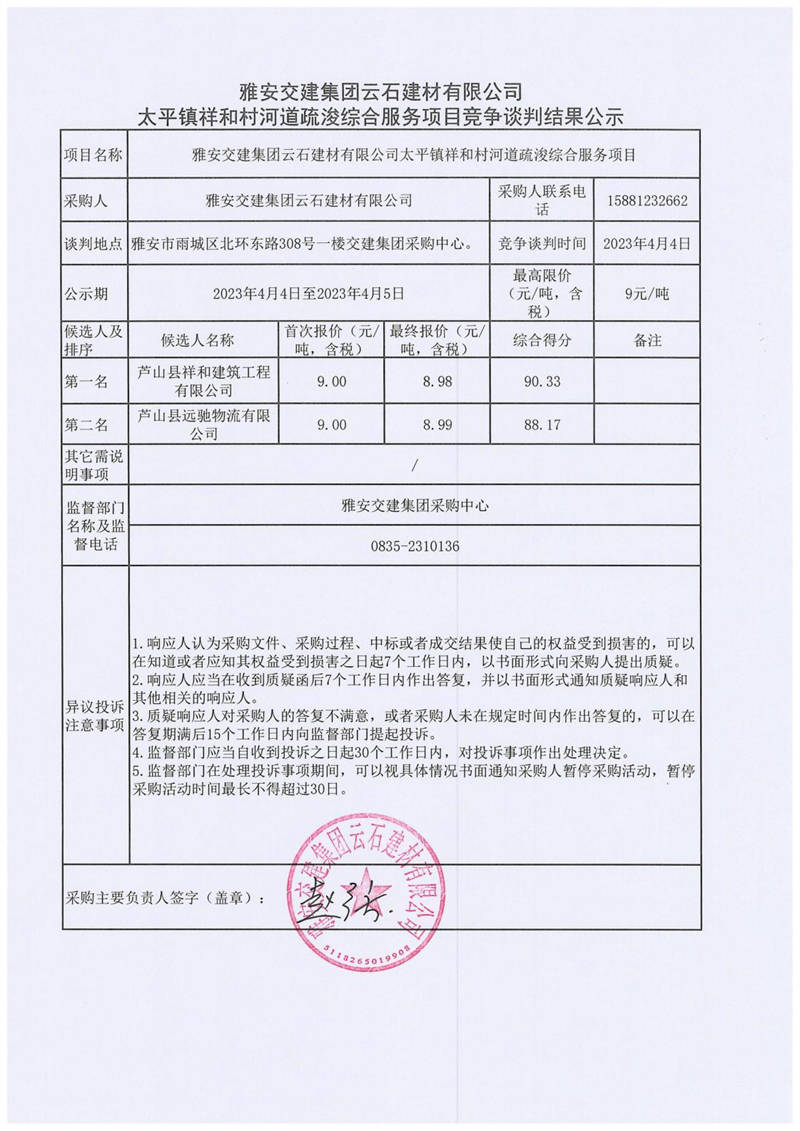 雅安交建集團云石建材有限公司太平鎮(zhèn)祥和村河道疏浚綜合服務項目競爭談判結(jié)果公示