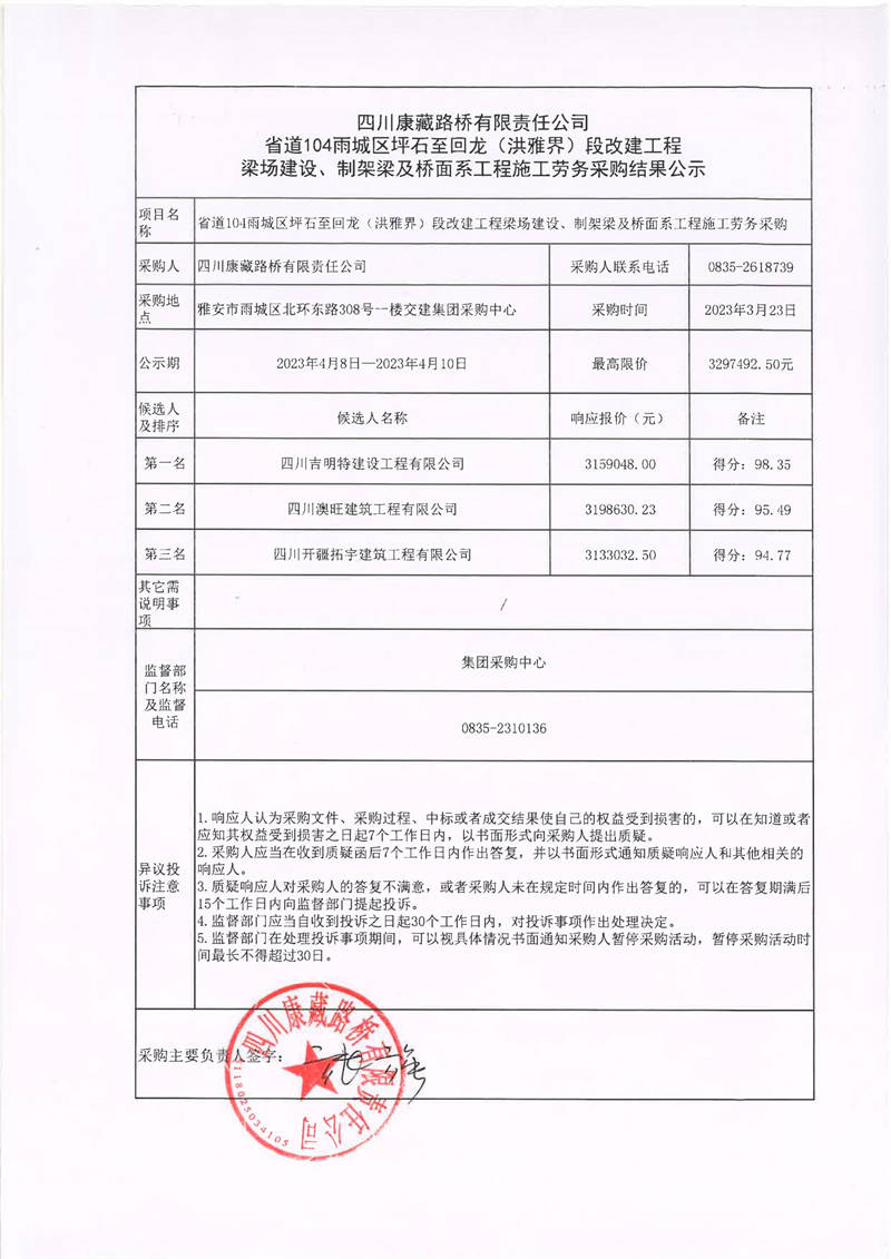 四川康藏路橋有限責任公司省道104雨城區(qū)坪石至回龍(洪雅界)段改建工程梁場建設、制架梁及橋面系工程施工勞務采購結(jié)果公示