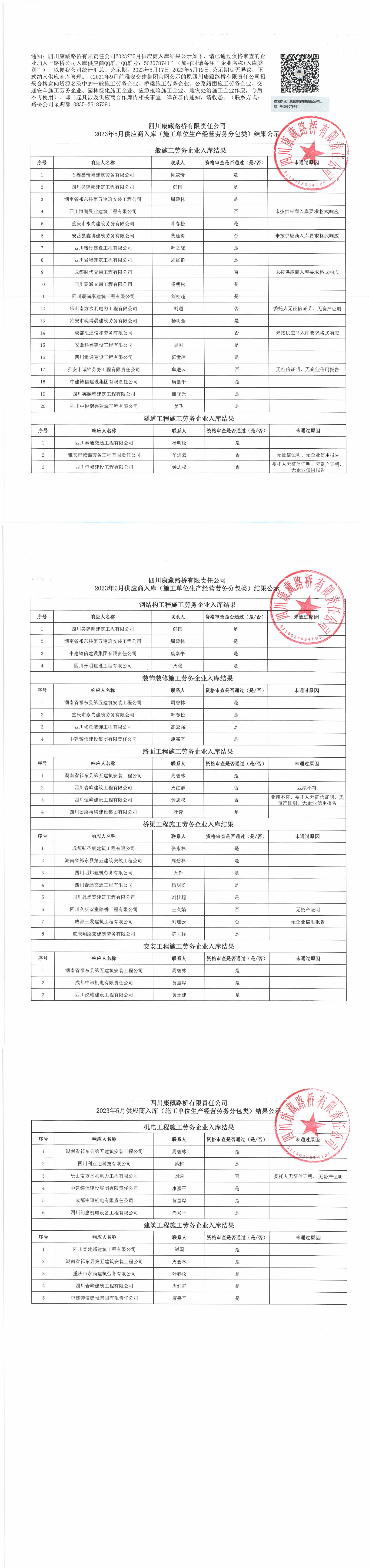 四川康藏路橋有限責任公司2023年5月供應商入庫(施工單位生產(chǎn)經(jīng)營勞務(wù)分包類)結(jié)果公示