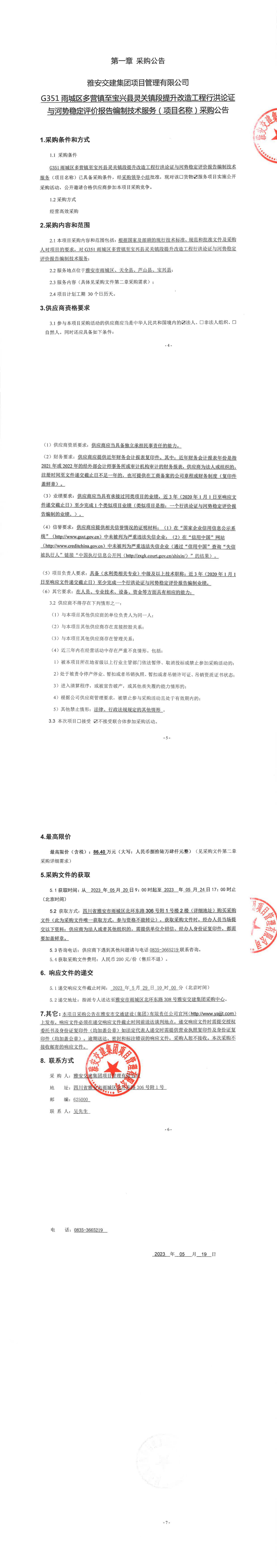 雅安交建集團(tuán)項(xiàng)目管理有限公司G351雨城區(qū)多營(yíng)鎮(zhèn)至寶興縣靈關(guān)鎮(zhèn)段提升改造工程行洪論證與河勢(shì)穩(wěn)定評(píng)價(jià)報(bào)告編制技術(shù)服務(wù)(項(xiàng)目名稱(chēng))采購(gòu)公告