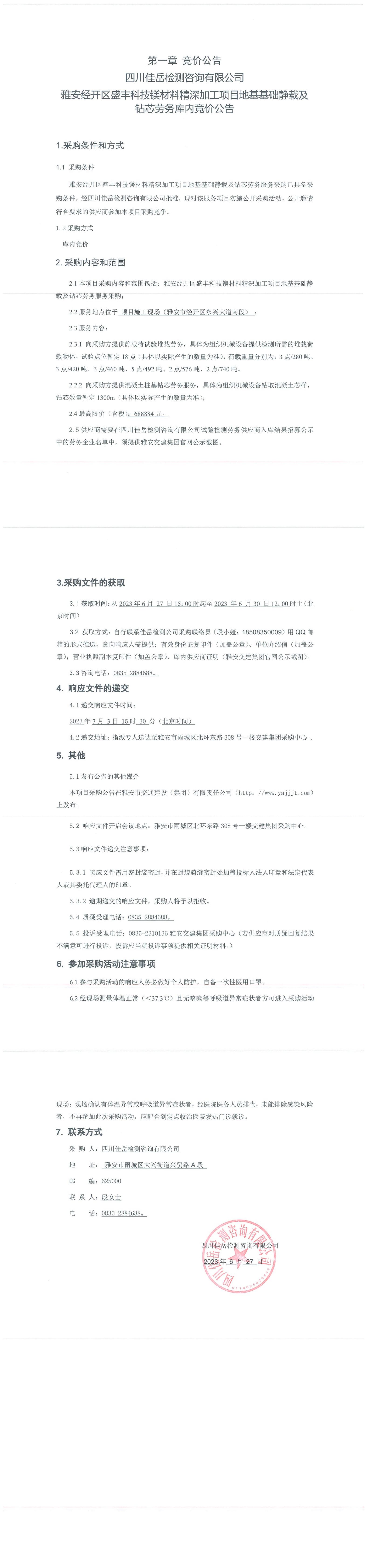 四川佳岳檢測咨詢有限公司雅安經(jīng)開區(qū)盛豐科技鎂材料精深加工項目地基基礎(chǔ)靜載及鉆芯勞務(wù)庫內(nèi)競價公告