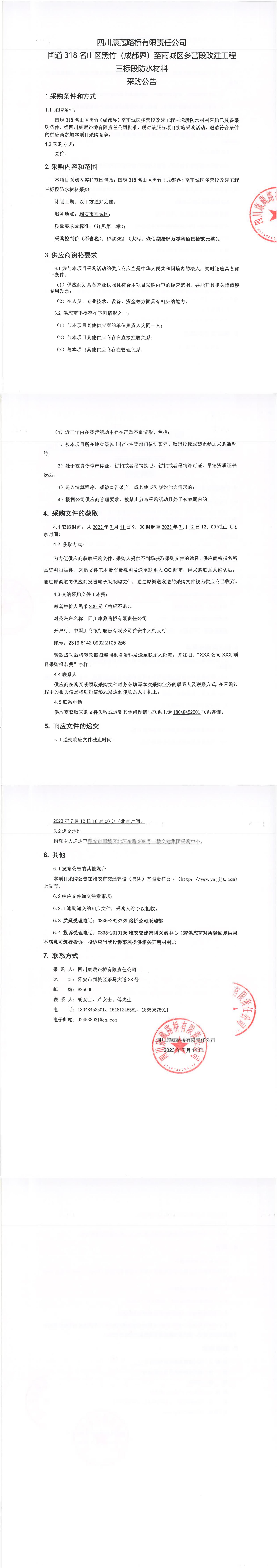 四川康藏路橋有限責(zé)任公司國(guó)道318名山區(qū)黑竹(成都界)至雨城區(qū)多營(yíng)段改建工程三標(biāo)段防水材料采購(gòu)公告