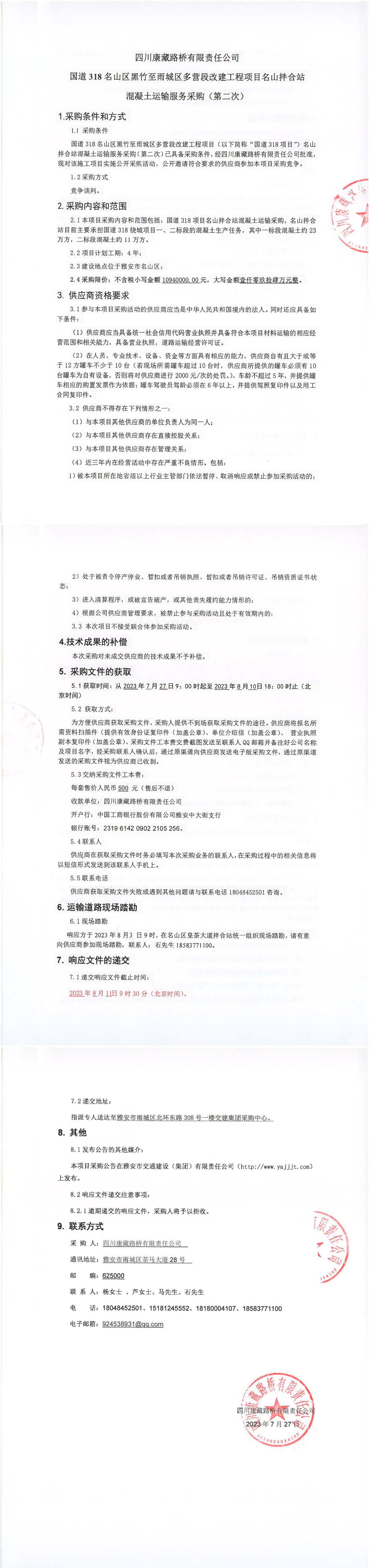 四川康藏路橋有限責(zé)任公司國道318名山區(qū)黑竹至雨城區(qū)多營段改建工程項(xiàng)目名山拌合站混凝土運(yùn)輸服務(wù)采購(第二次)