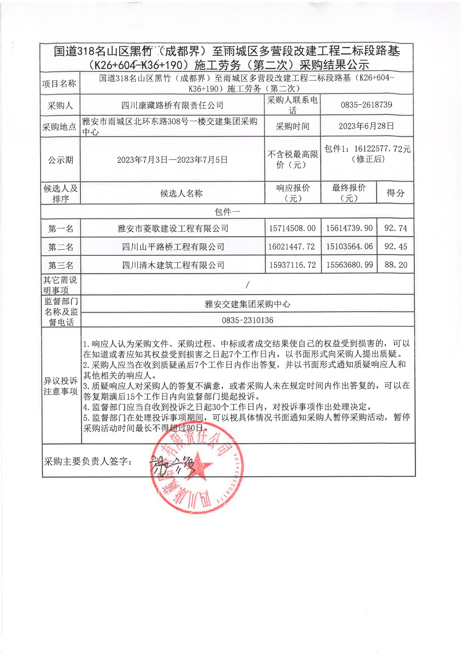 四川康藏路橋有限責任公司國道318名山區(qū)黑竹(成都界)至雨城區(qū)多營段改建工程二標段路基(K26+604-K36+190)施工勞務(wù)(第二次)采購結(jié)果公示