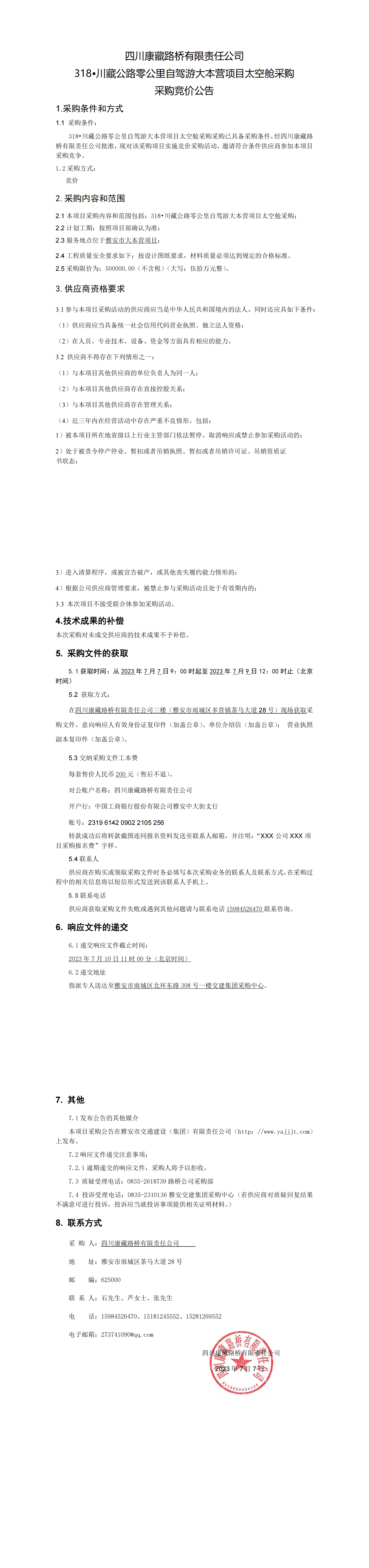 四川康藏路橋有限責(zé)任公司318·川藏公路零公里自駕游大本營項(xiàng)目太空艙采購競價(jià)公告