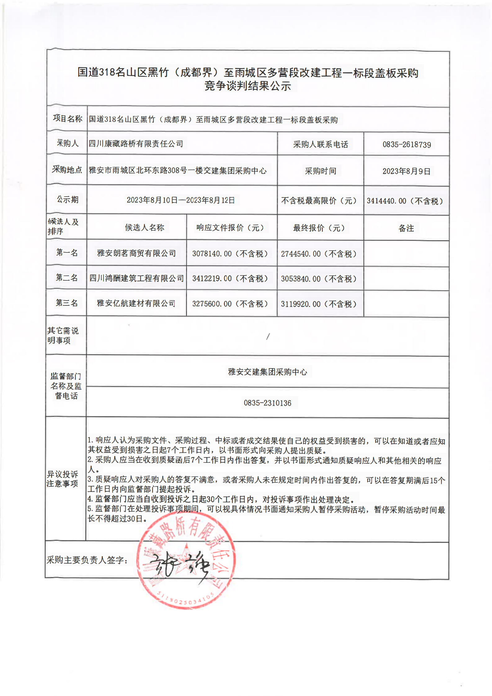 四川康藏路橋有限責(zé)任公司國道318名山區(qū)黑竹(成都界)至雨城區(qū)多營段改建工程一標(biāo)段蓋板采購競爭談判結(jié)果公示