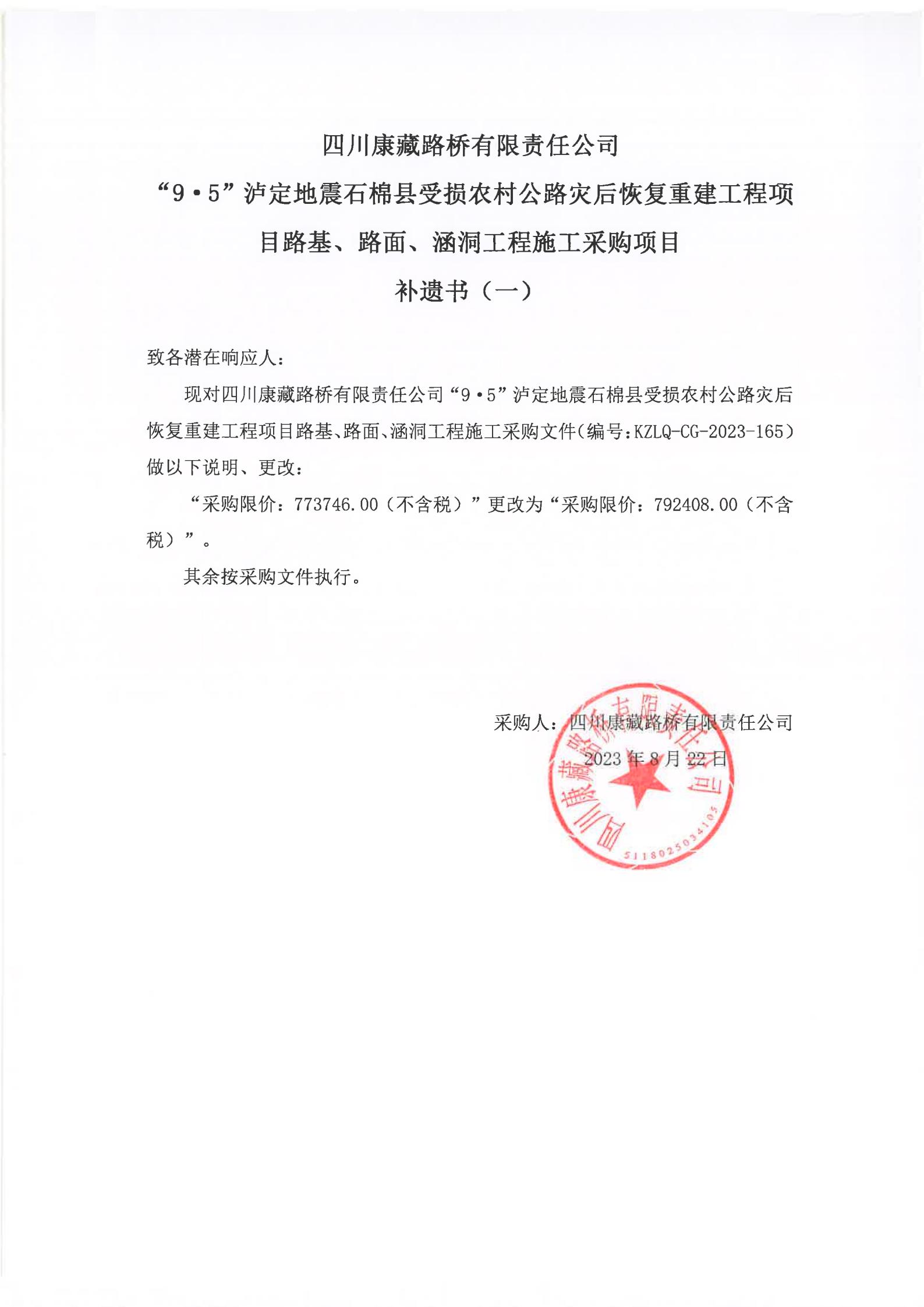 四川康藏路橋有限責(zé)任公司“9·5”瀘定地震石棉縣受損農(nóng)村公路災(zāi)后恢復(fù)重建工程項(xiàng)目路基、路面、涵洞工程施工采購(gòu)項(xiàng)目補(bǔ)遺書(一)