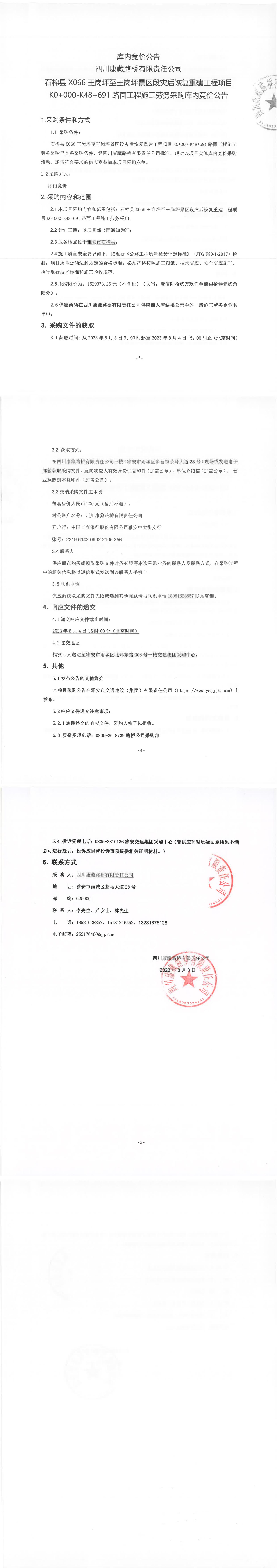 四川康藏路橋有限責(zé)任公司石棉縣X066王崗坪至王崗坪景區(qū)段災(zāi)后恢復(fù)重建工程項(xiàng)目K0+000-K48+691路面工程施工勞務(wù)采購庫內(nèi)競價(jià)公告