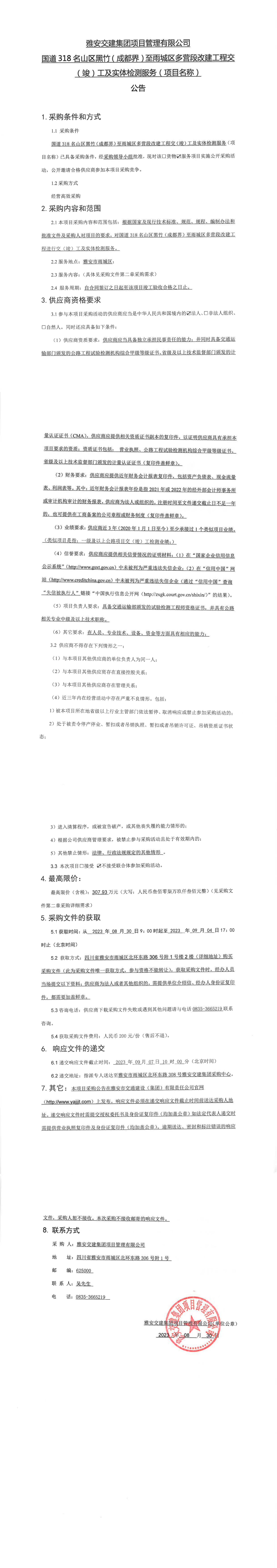 雅安交建集團項目管理有限公司國道318名山區(qū)黑竹(成都界)至雨城區(qū)多營段改建工程交(竣)工及實體檢測服務(項目名稱)采購公告