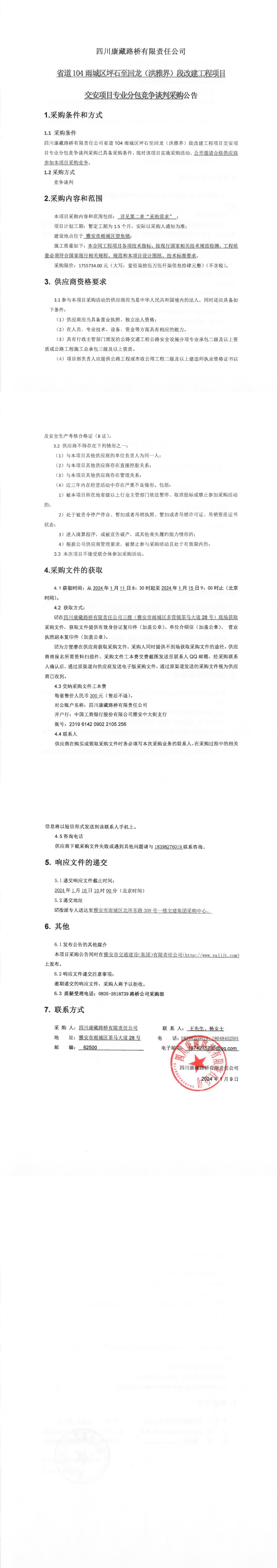 四川康藏路橋有限責任公司省道104雨城區(qū)坪石至回龍(洪雅界)段改建工程項目交安項目專業(yè)分包競爭談判采購公告