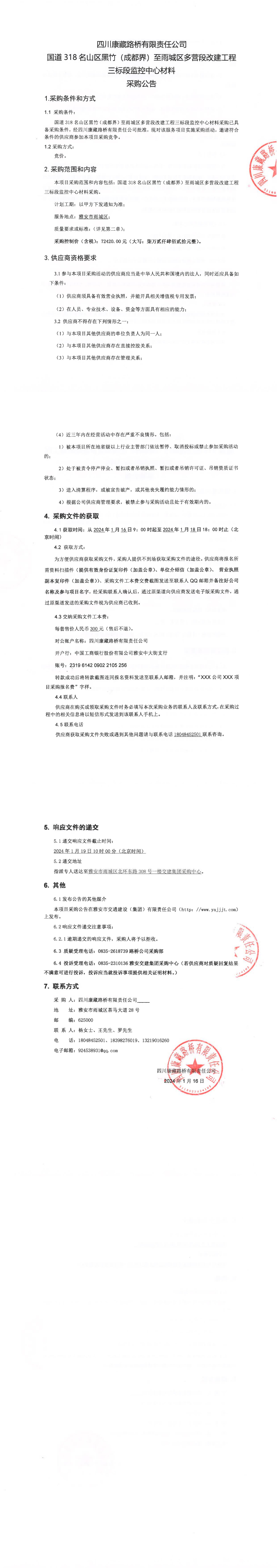 四川康藏路橋有限責任公司國道318名山區(qū)黑竹(成都界)至雨城區(qū)多營段改建工程三標段監(jiān)控中心材料采購公告