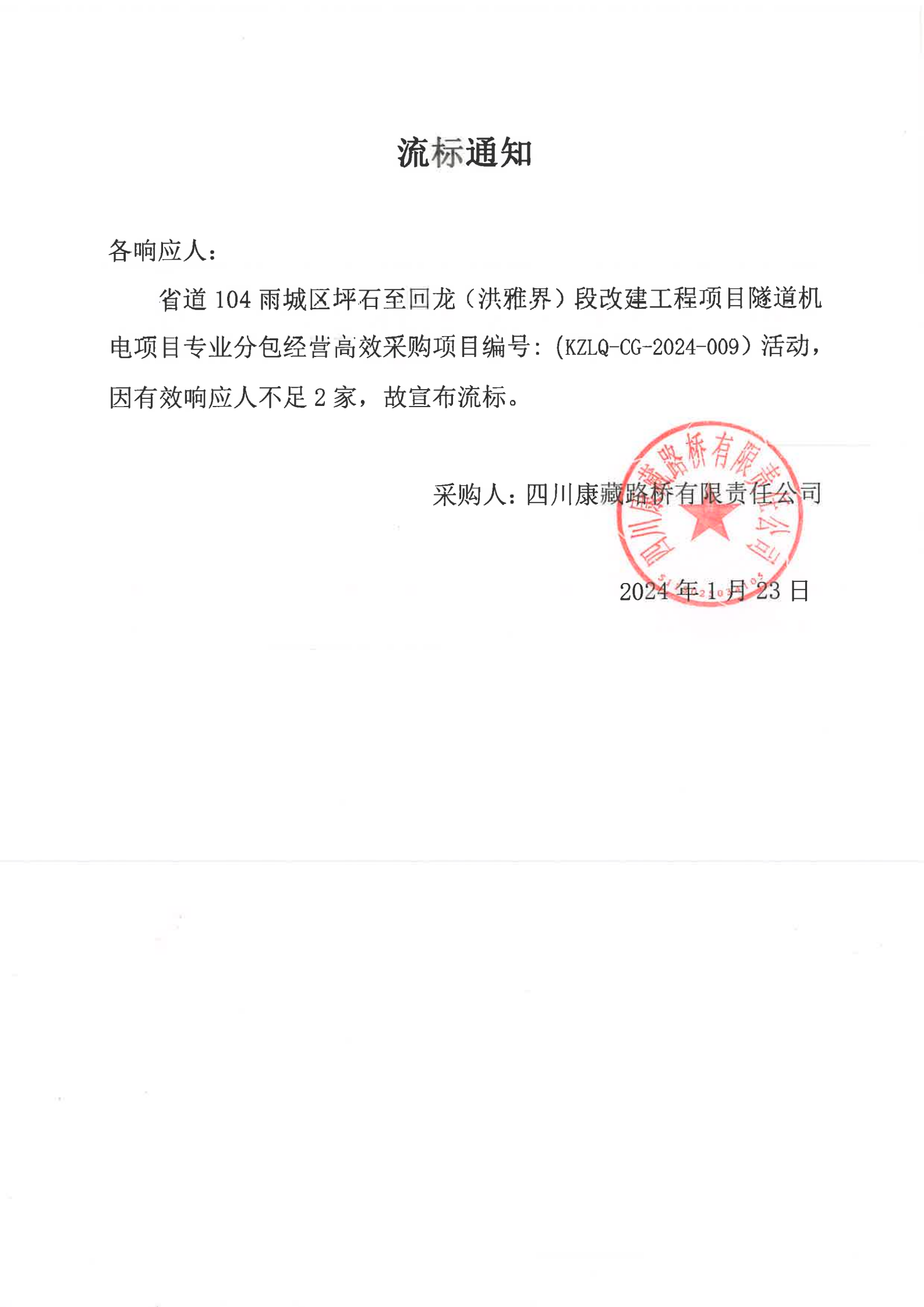四川康藏路橋有限責(zé)任公司省道104雨城區(qū)坪石至回龍(洪雅界)段改建工程項(xiàng)目隧道機(jī)電項(xiàng)目專業(yè)分包經(jīng)營高效采購流標(biāo)通知