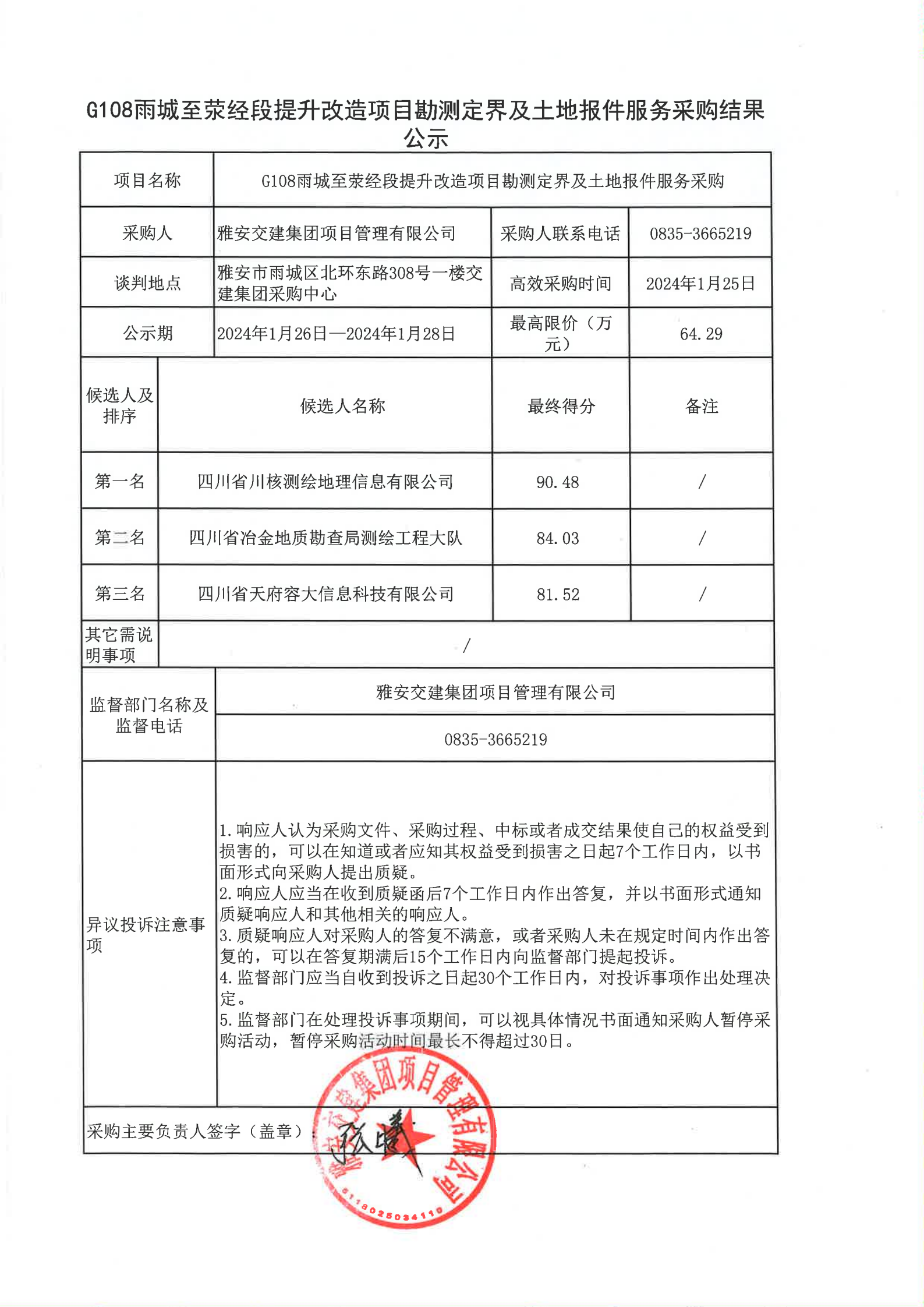 四川康藏路橋有限責(zé)任公司G108雨城至滎經(jīng)段提升改造項目勘測定界及土地報件服務(wù)采購結(jié)果公示
