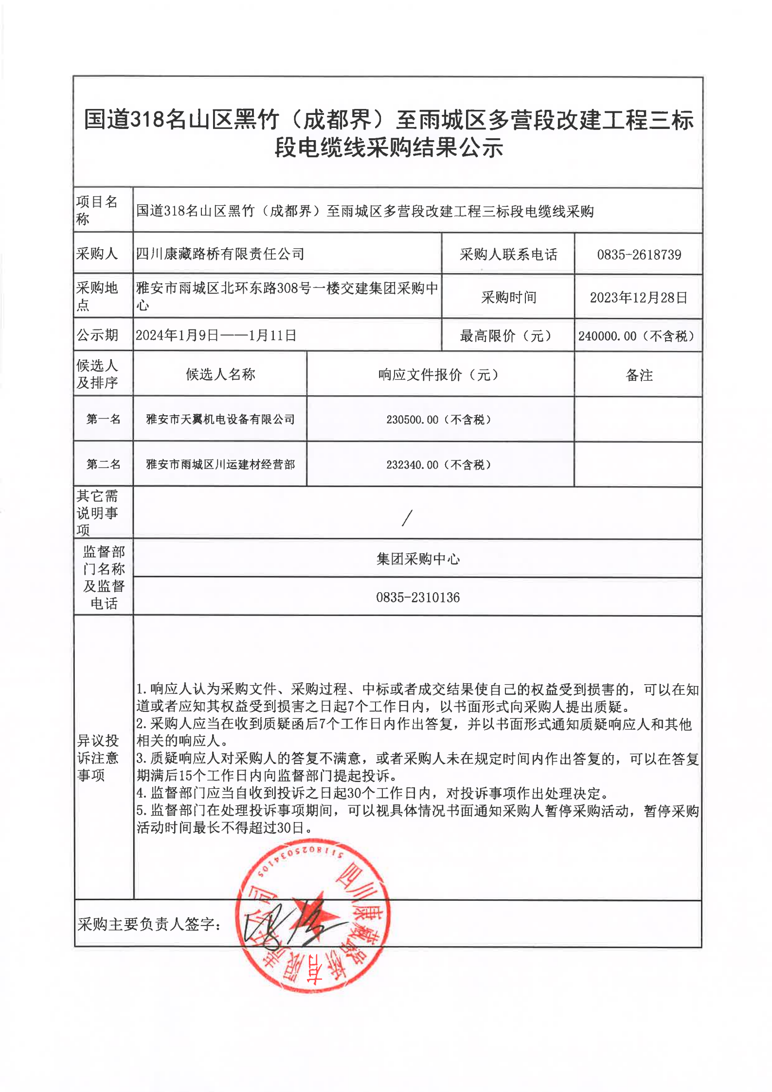四川康藏路橋有限責任公司國道318名山區(qū)黑竹(成都界)至雨城區(qū)多營段改建工程三標段電纜線采購結果公示
