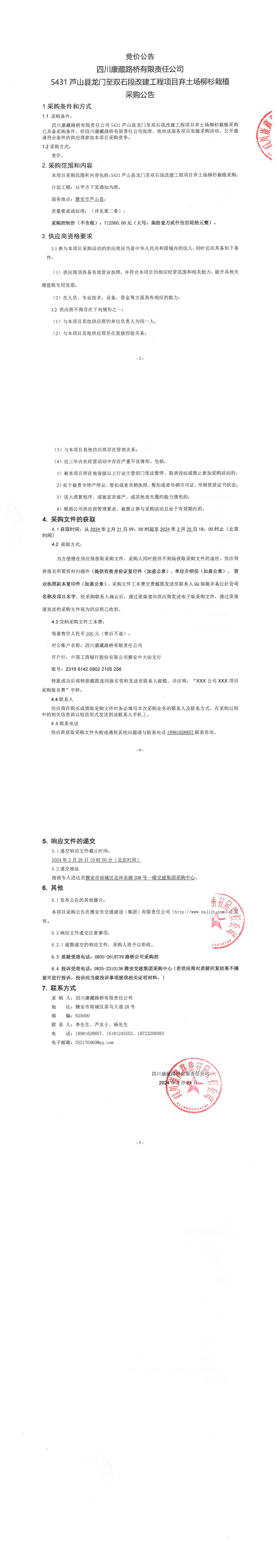 四川康藏路橋有限責(zé)任公司S431蘆山縣龍門至雙石段改建工程項目棄土場柳杉栽植采購公告