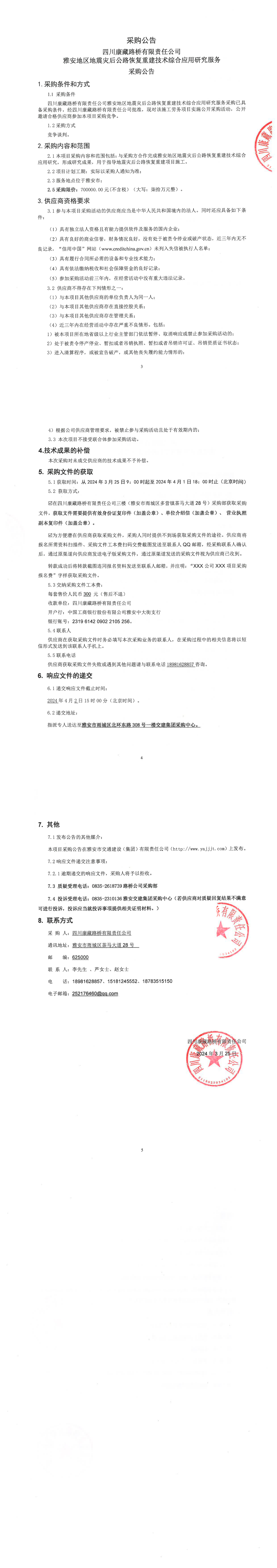 四川康藏路橋有限責(zé)任公司雅安地區(qū)地震災(zāi)后公路恢復(fù)重建技術(shù)綜合應(yīng)用研究服務(wù)采購(gòu)公告