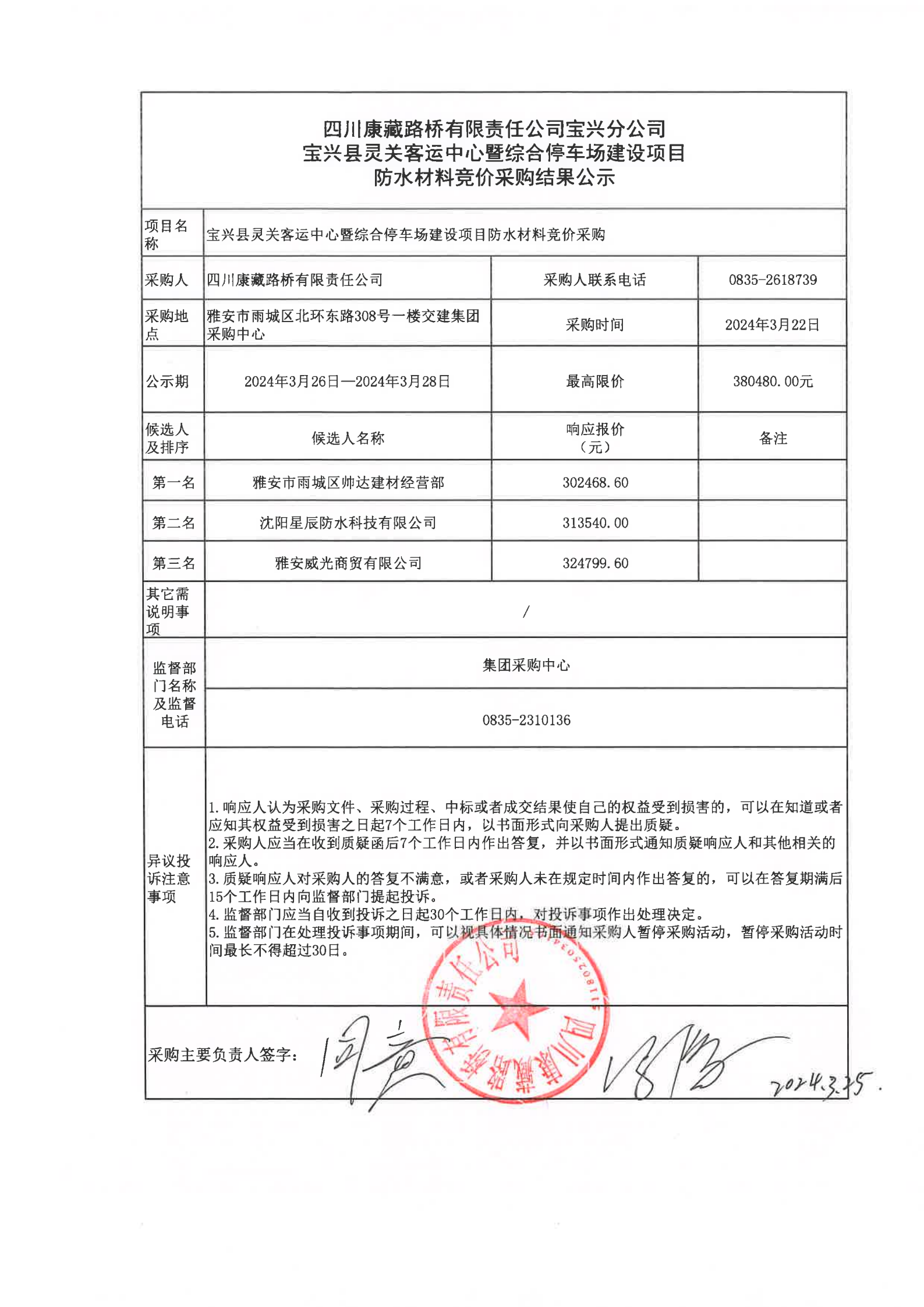 四川康藏路橋有限責任公司寶興縣靈關(guān)客運中心暨綜合停車場建設項目防水材料競價采購結(jié)果公示