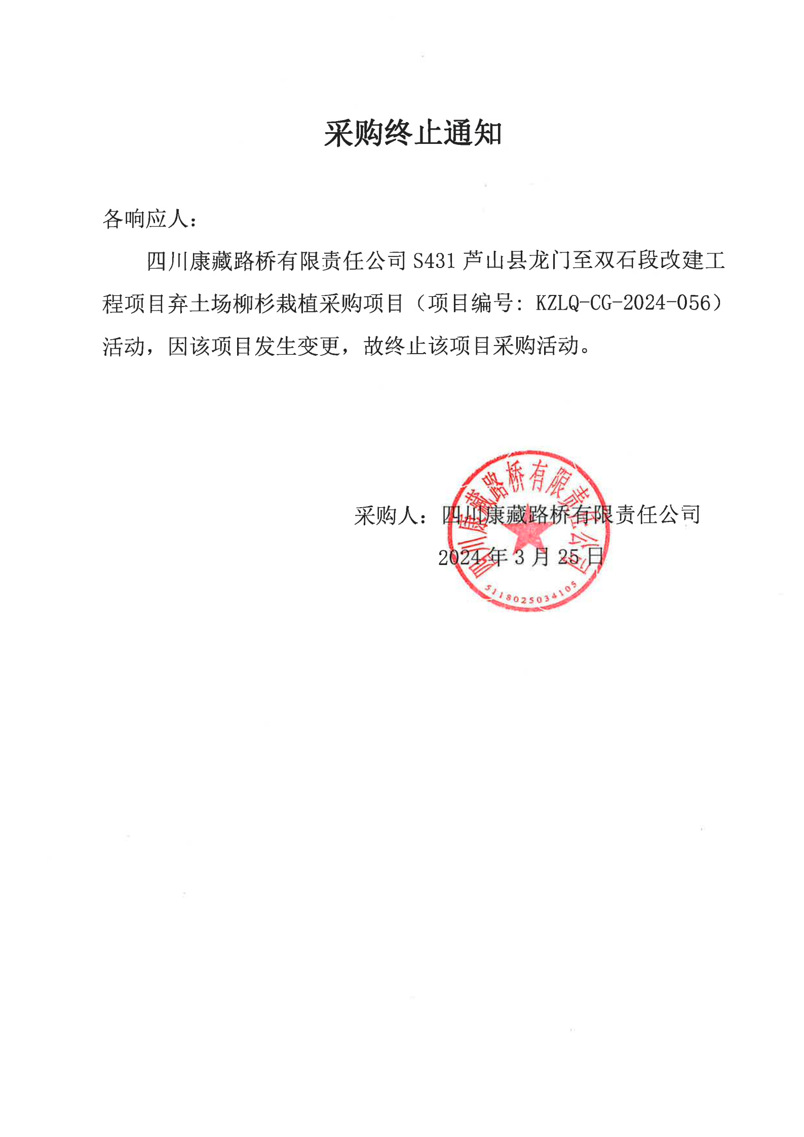 四川康藏路橋有限責(zé)任公司S431蘆山縣龍門鎮(zhèn)至雙石段改建工程項(xiàng)目棄土場(chǎng)柳杉載植采購終止通知