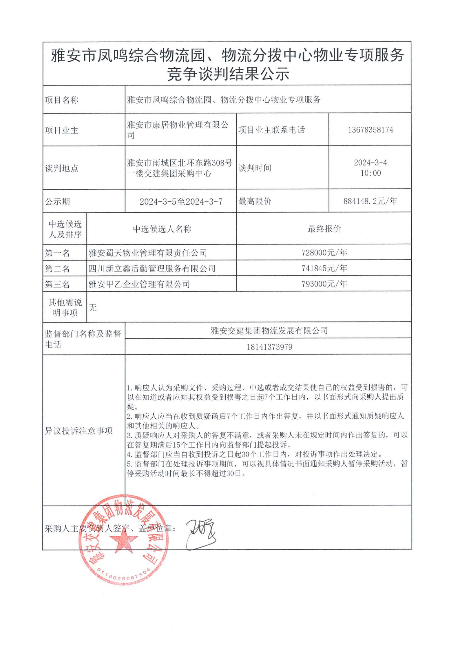 雅安市康居物業(yè)管理有限公司雅安市鳳鳴綜合物流園、物流分撥中心物業(yè)專項服務競爭談判結果公示