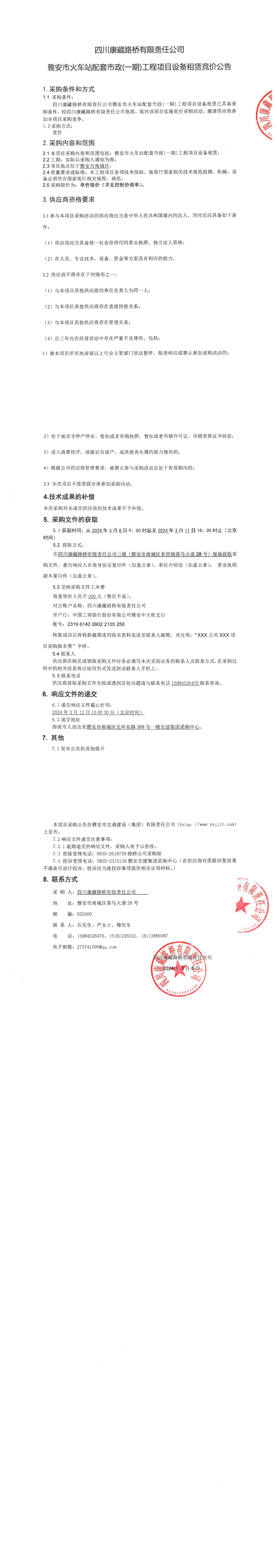 四川康藏路橋有限責(zé)任公司雅安市火車站配套市政(一期)工程項目設(shè)備租賃競價公告