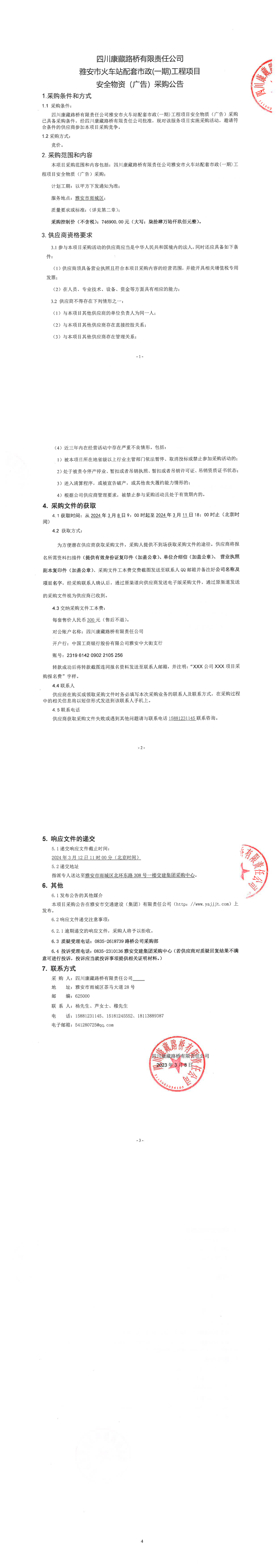 四川康藏路橋有限責(zé)任公司雅安市火車站配套市政(一期)工程項目安全物質(zhì)(廣告)采購公告
