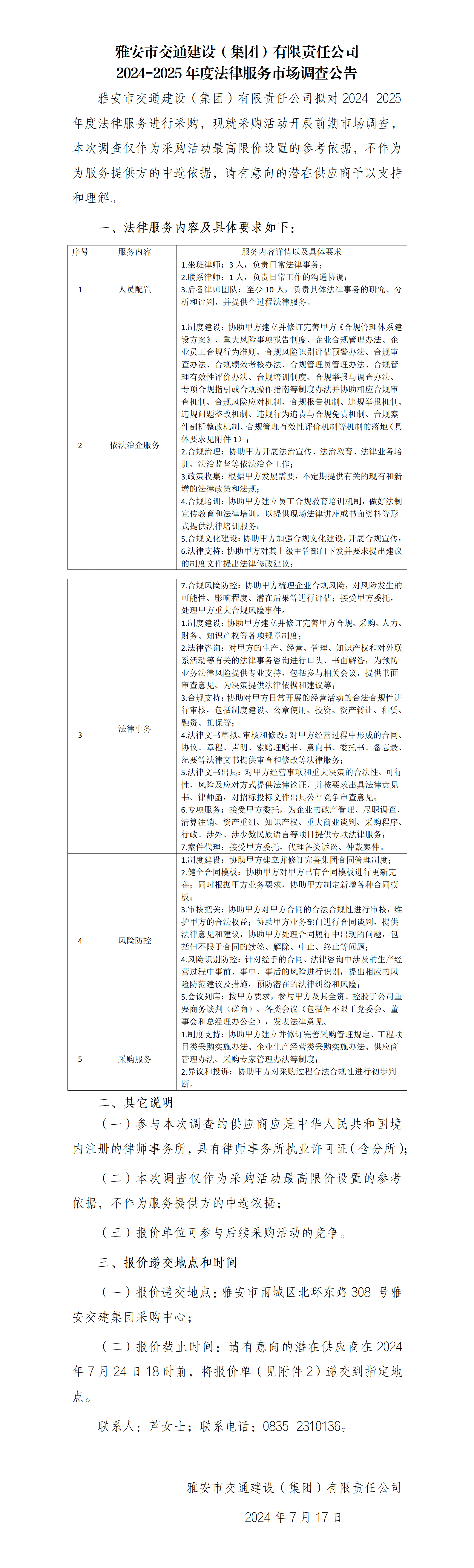 雅安市交通建設(shè)(集團)有限責(zé)任公司2024-2025年度法律服務(wù)市場調(diào)查公告