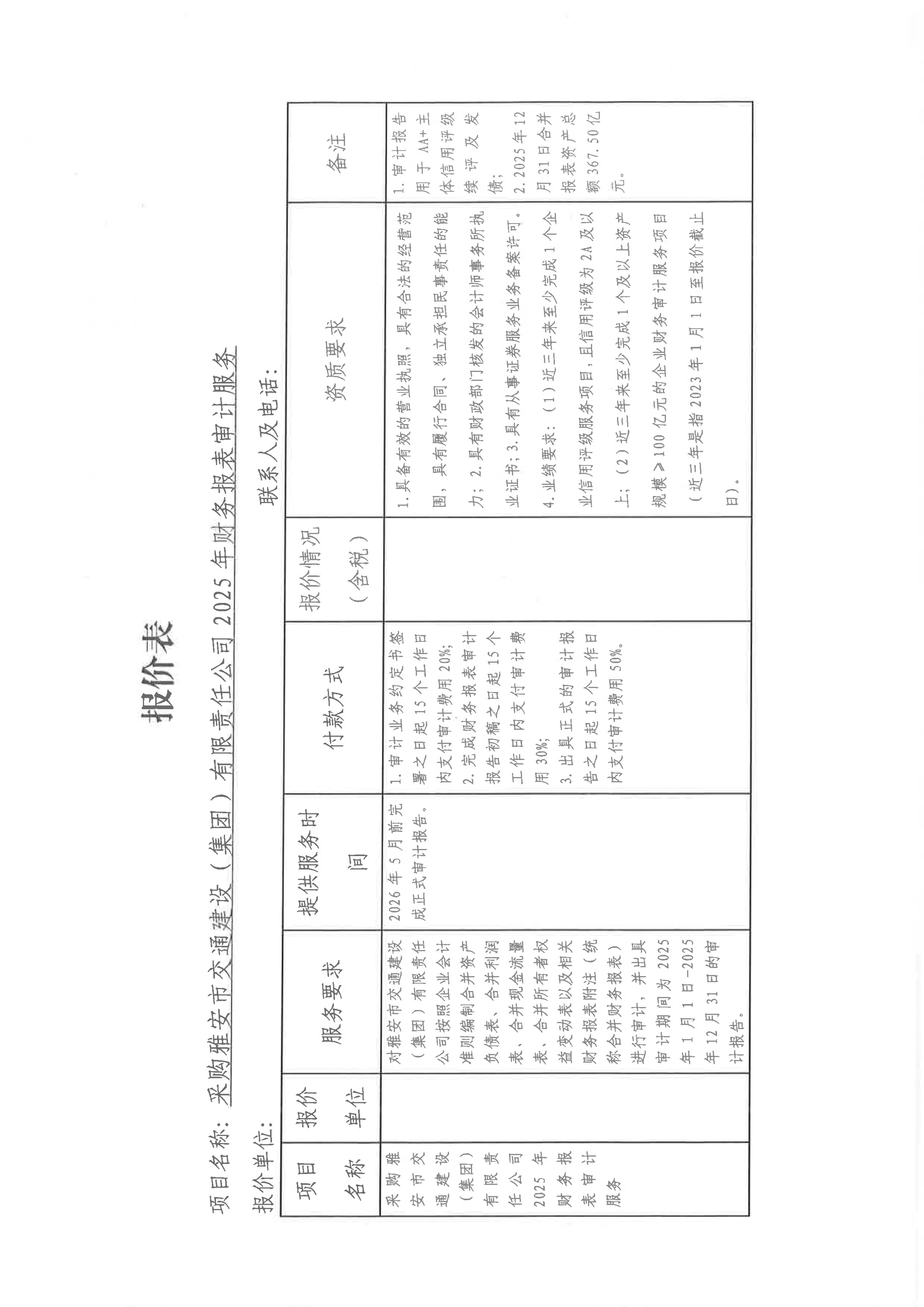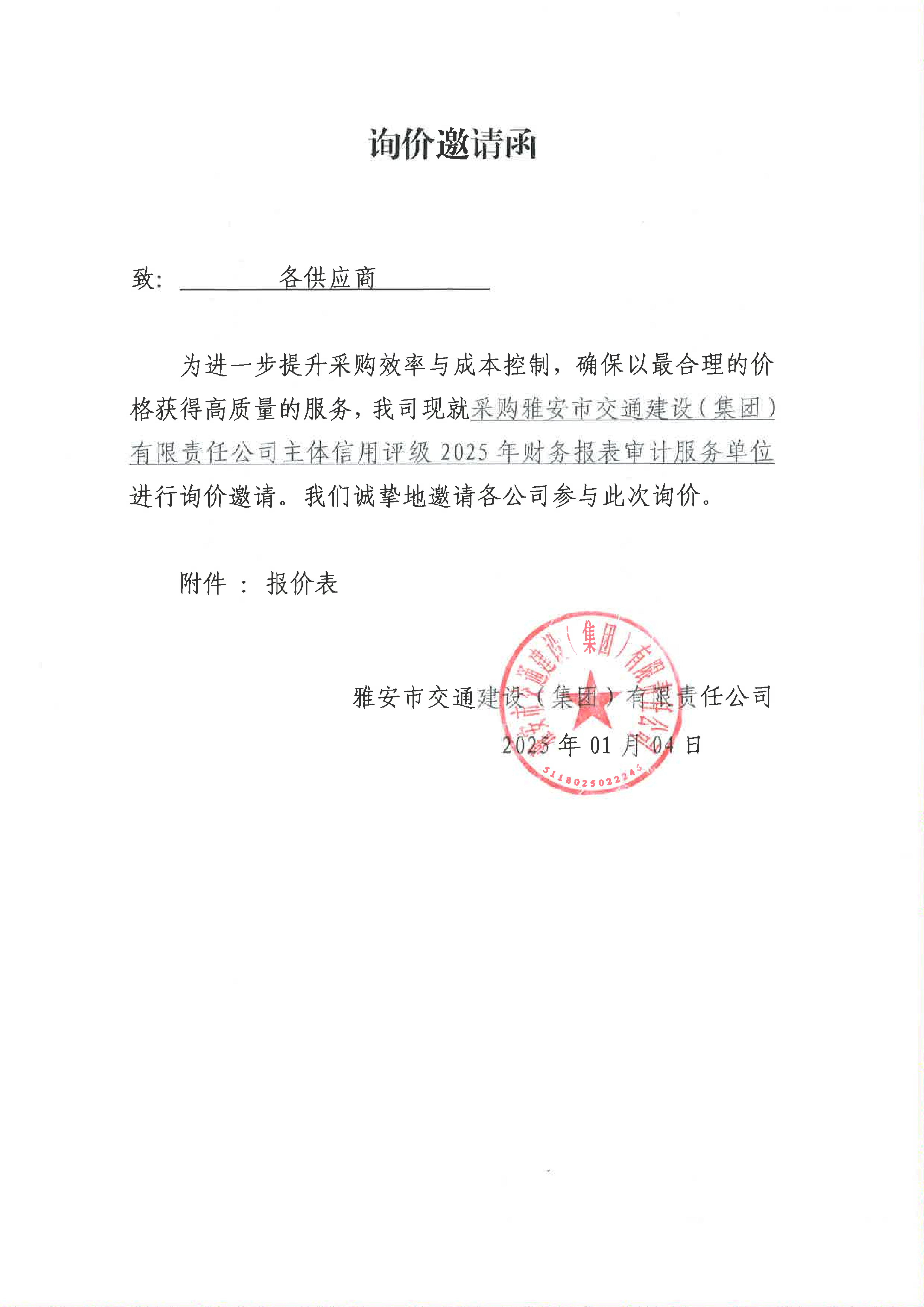 關(guān)于采購雅安市交通建設(shè)(集團(tuán))有限責(zé)任公司主體信用評級2025年財務(wù)報表審計服務(wù)限價的詢價函
