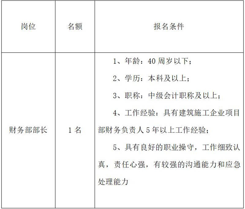 雅安交建集團(tuán)路橋有限責(zé)任公司是雅安市交通建設(shè)(集團(tuán))有限責(zé)任公司下屬子公司,主要從事道路、橋梁修建,F(xiàn)根據(jù)公司業(yè)務(wù)發(fā)展需要,擬向社會(huì)公開招聘1名財(cái)務(wù)部部長(zhǎng),現(xiàn)將有關(guān)事項(xiàng)公告如下: