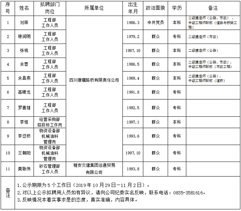 雅安交建集團所屬子公司擬聘用人員公示