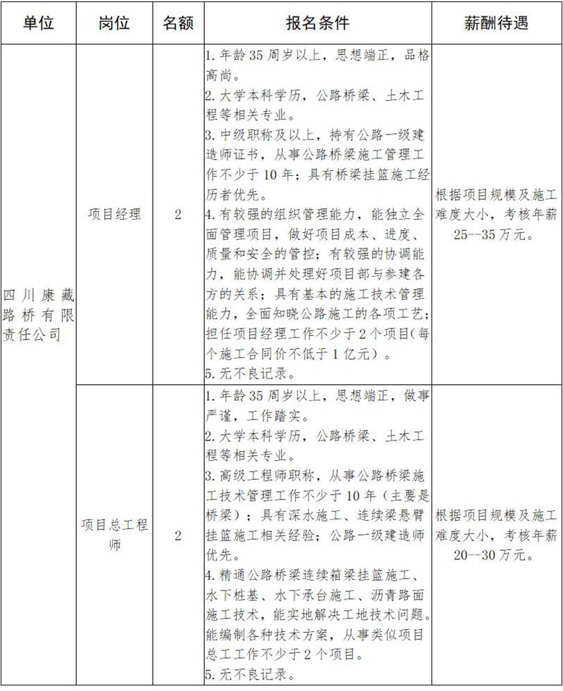 根據(jù)發(fā)展需要,決定面向社會(huì)公開(kāi)招聘雅安市交通建設(shè)(集團(tuán))有限責(zé)任公司(以下簡(jiǎn)稱(chēng)“雅安交建集團(tuán)”)所屬子公司工程項(xiàng)目主要負(fù)責(zé)人10名,現(xiàn)將有關(guān)事項(xiàng)公告如下: