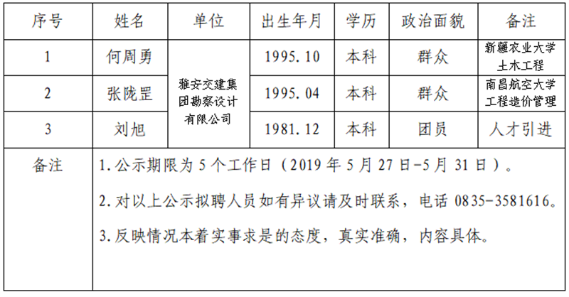 雅安交建集團(tuán)子公司擬聘用人員公示(勘察設(shè)計(jì)公司)