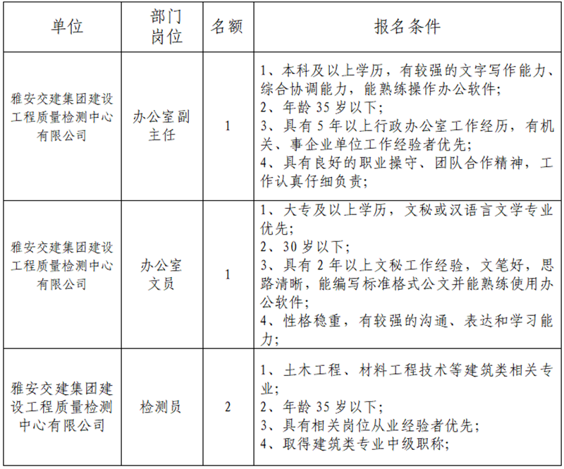 根據(jù)發(fā)展需要,決定面向社會公開招聘雅安市交通建設(shè)(集團(tuán))有限責(zé)任公司(以下簡稱“雅安交建集團(tuán)”)所屬子公司工作人員4名,現(xiàn)將有關(guān)事項(xiàng)公告如下: