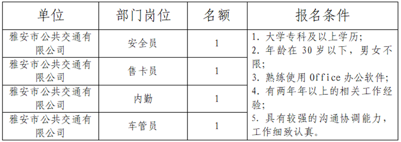 1、報名。公告發(fā)布在雅安市交通建設(集團)有限責任公司門戶網(wǎng)站,自發(fā)布之日起,即可報名。截止時間為2019年6月8日。網(wǎng)上報名,報名者須如實填寫《報名登記表》。在規(guī)定時間內將填寫好的《報名登記表》、本人有效身份證、畢業(yè)證、職稱、執(zhí)業(yè)資格及工作業(yè)績等證明材料以電子文檔的形式發(fā)送至郵箱104515026@qq.com(姓名+應聘公司名稱+應聘工作崗位)。咨詢電話15908143154。