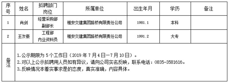 雅安交建集團(tuán)子公司擬聘用人員公示(路橋公司)