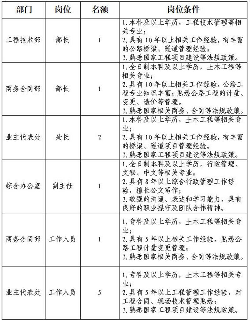 根據(jù)發(fā)展需要,決定面向社會公開招聘雅安市交通建設(shè)(集團)有限責(zé)任公司(以下簡稱“雅安交建集團”)所屬子公司管理人員及工作人員共計11名,現(xiàn)將有關(guān)事項公告如下:
