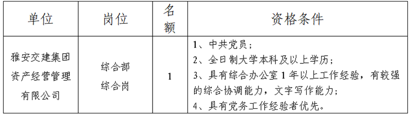 根據(jù)發(fā)展需要,決定面向社會公開招聘雅安市交通建設(shè)(集團(tuán))有限責(zé)任公司(以下簡稱“雅安交建集團(tuán)”)所屬子一般工作人員1名,現(xiàn)將有關(guān)事項(xiàng)公告如下: