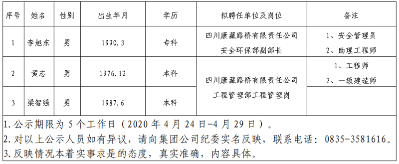 根據(jù)雅安市交通建設(shè)(集團)有限責任公司招聘公告,經(jīng)公開報名、資格初審、筆試、面試、體檢考察等環(huán)節(jié),現(xiàn)將以下3名擬聘用人員予以公示: