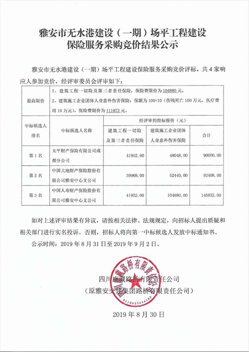 雅安市無(wú)水港建設(shè)(一期)場(chǎng)平工程建設(shè)保險(xiǎn)服務(wù)采購(gòu)競(jìng)價(jià)結(jié)果公示