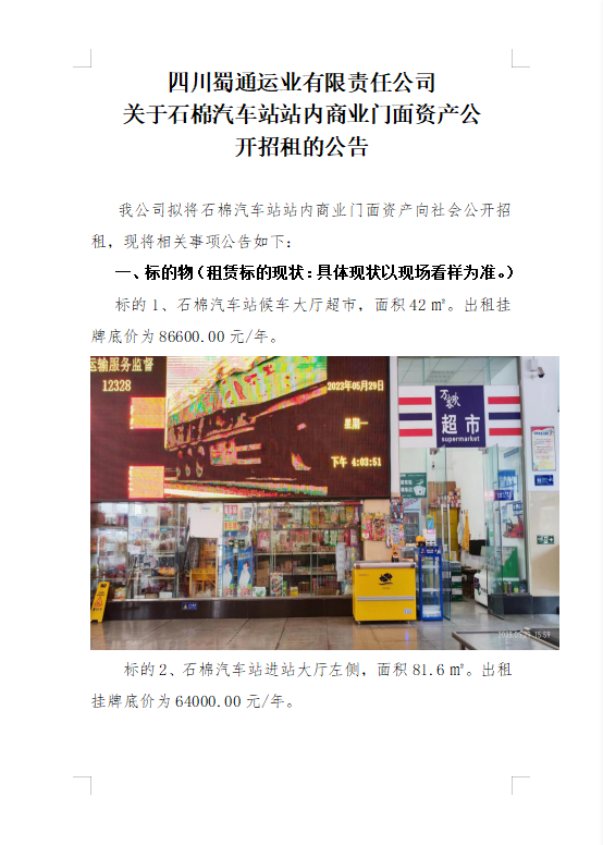 四川蜀通運業(yè)有限責任公司關(guān)于石棉汽車站站內(nèi)商業(yè)門面資產(chǎn)公開招租的公告