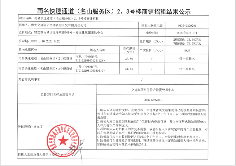 交通資源開發(fā)公司雨名快速通道(名山服務(wù)區(qū))2、3號樓商鋪招租結(jié)果公示