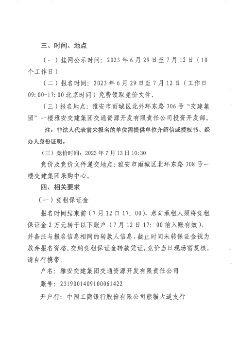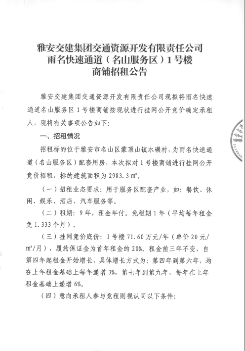 雅安交建集團交通資源開發(fā)有限責(zé)任公司雨名快速通道名山服務(wù)區(qū)1號樓招租公告