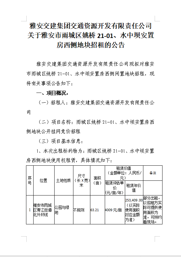 雅安交建集團(tuán)交通資源開發(fā)有限責(zé)任公司關(guān)于雅安市雨城區(qū)姚橋21-01、水中壩安置房西側(cè)地塊招租的公告