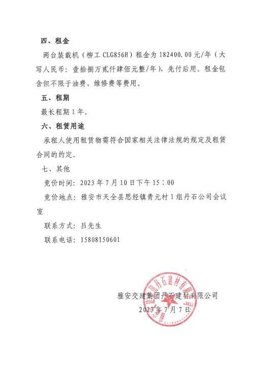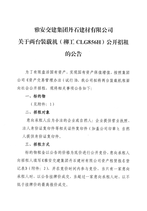 雅安交建集團丹石建材有限公司關(guān)于2臺裝載機公開招租的公告附件